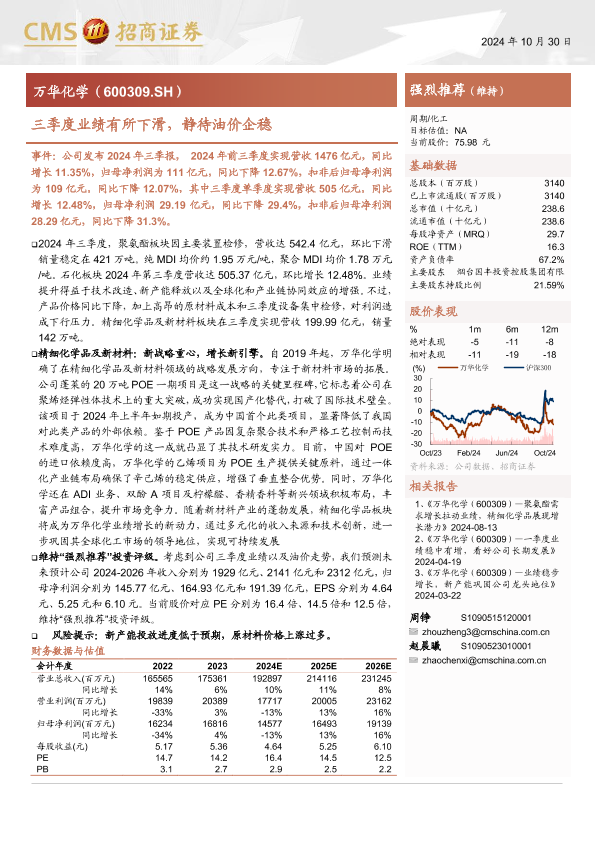 【海通证券】【20241030】万华化学(600309)三季度业绩有所下滑,静待油价企稳-12页