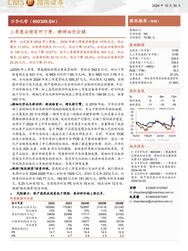 万华化学 三季度业绩 新材料 油价企稳 精细化学品