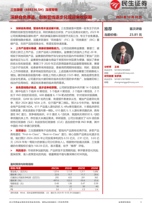 【民生证券】【20241030】三生国健(688336)深度报告:深耕自免赛道,创新管线逐步兑现迎来收获期-46页