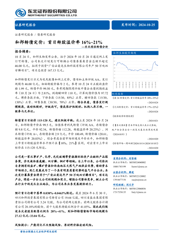 【东北证券】【20241025】东北固收转债分析-和邦转债定价:首日转股溢价率16%~21%-12页