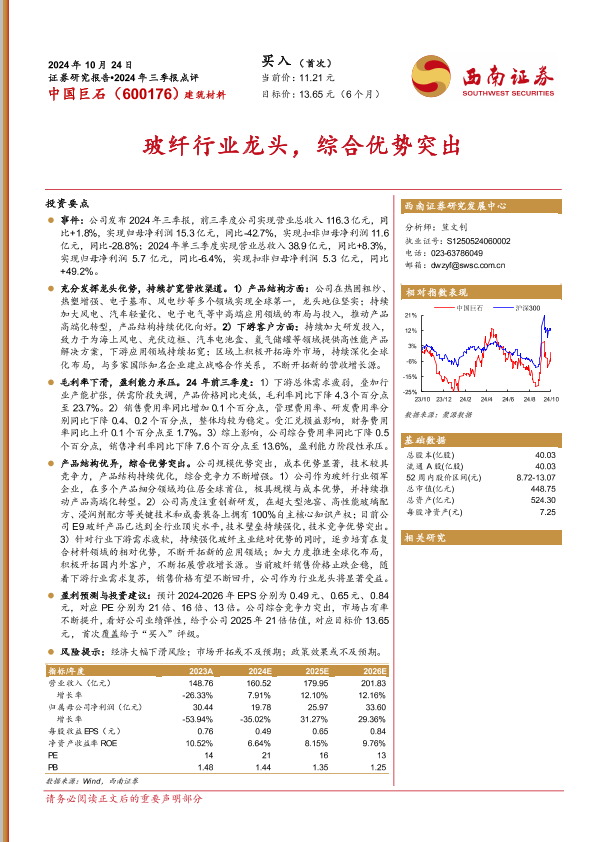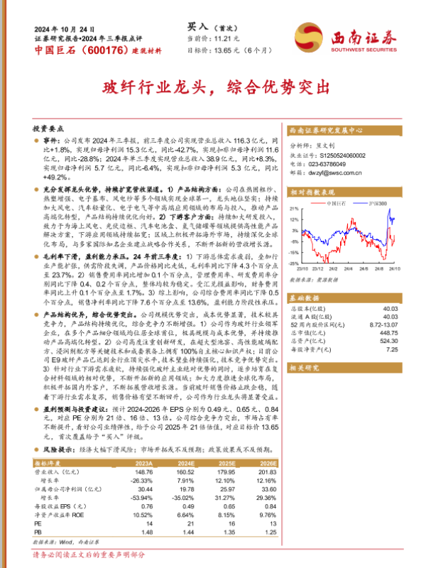【西南证券】【20241024】中国巨石(600176)2024年三季报点评:玻纤行业龙头,综合优势突出-11页