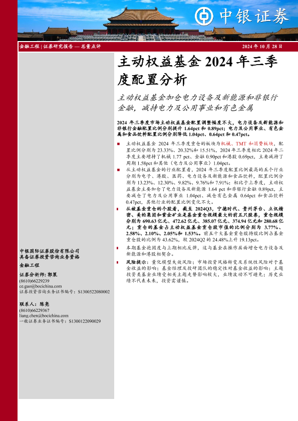 【中银证券】【20241028】主动权益基金2024年三季度配置分析:主动权益基金加仓电力设备及新能源和非银行金融,减持电力及公用事业和有色金属-14页