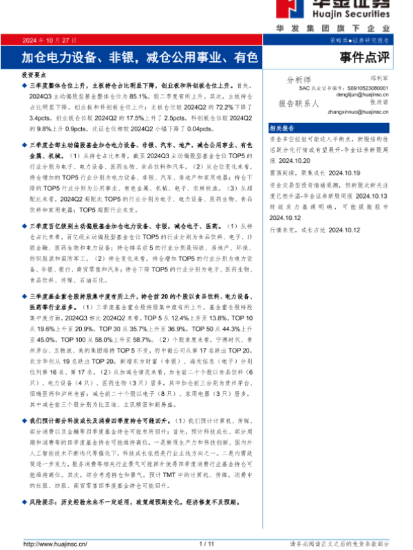【华金证券】【20241027】事件点评:加仓电力设备、非银,减仓公用事业、有色-11页