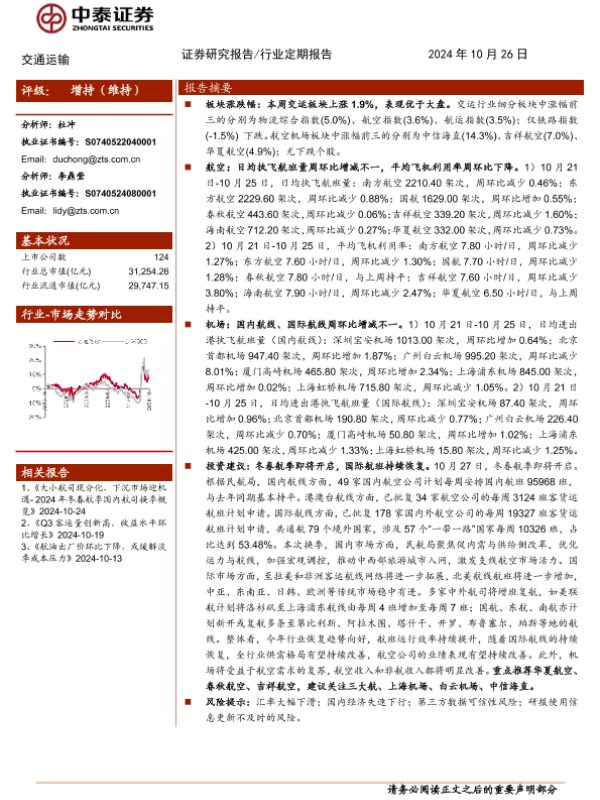 【中泰证券】【20241026】交通运输行业:冬春航季即将开启,国际航班持续恢复-23页