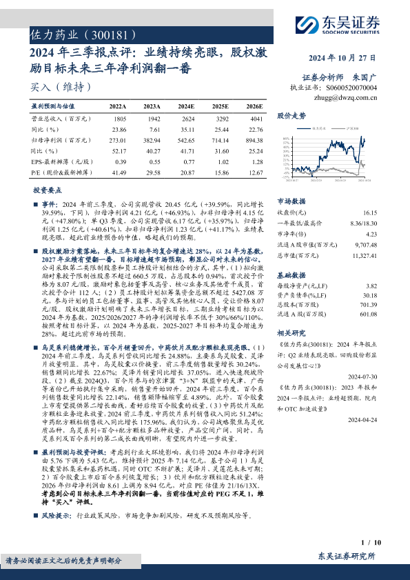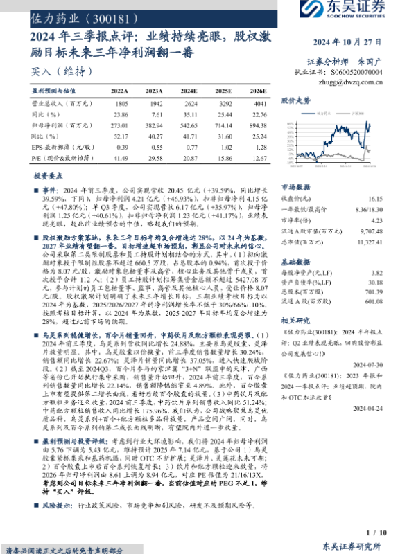 【东吴证券】【20241027】佐力药业(300181)2024年三季报点评:业绩持续亮眼,股权激励目标未来三年净利润翻一番-10页