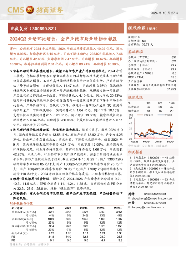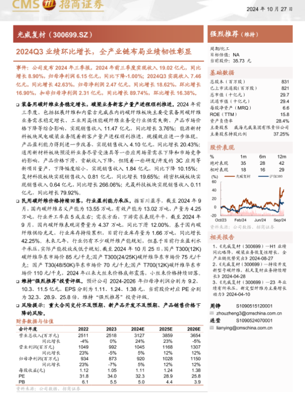 【海通证券】【20241028】光威复材(300699)2024Q3业绩环比增长,全产业链布局业绩韧性彰显-20页