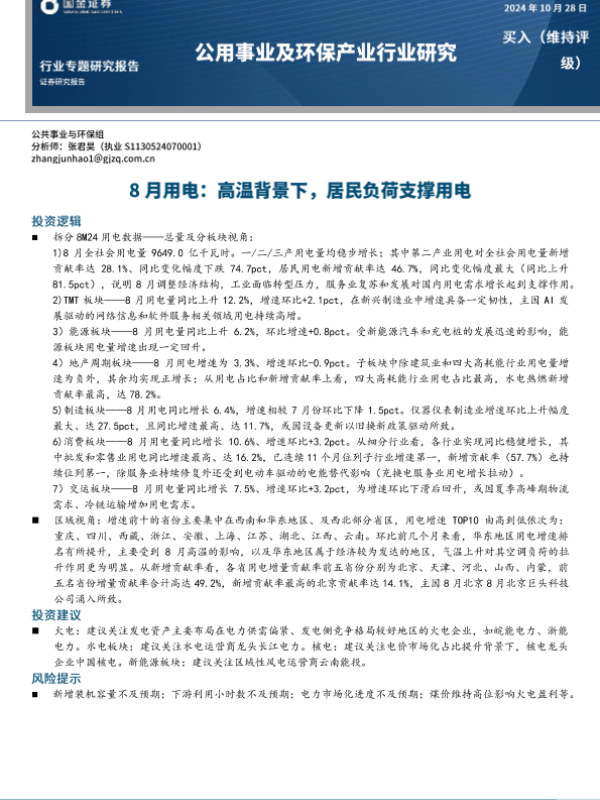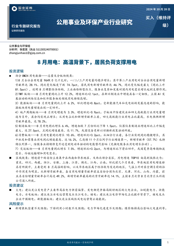 【国金证券】【202410】公用事业行业专题研究:8月用电,高温背景下,居民负荷支撑用电-15页