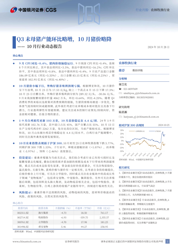 【银河证券】【20241028】农林牧渔行业10月行业动态报告:Q3末母猪产能环比略增,10月猪价略降-23页
