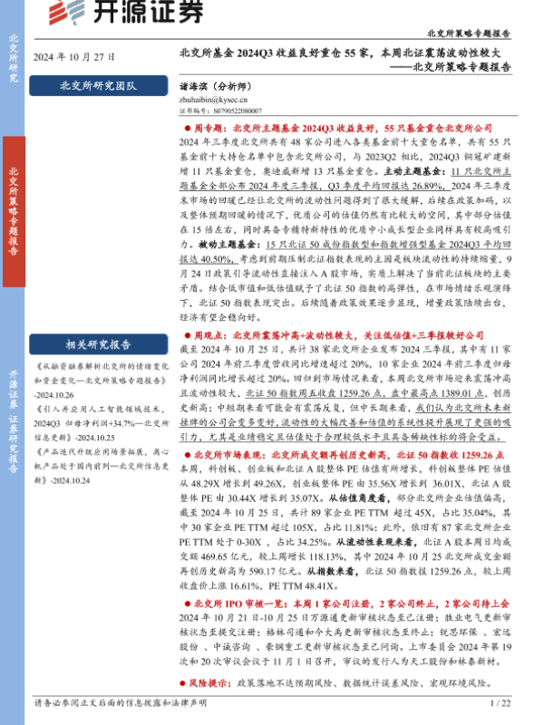 【开源证券】【20241027】北交所策略专题报告:北交所基金2024Q3收益良好重仓55家,本周北证震荡波动性较大-22页