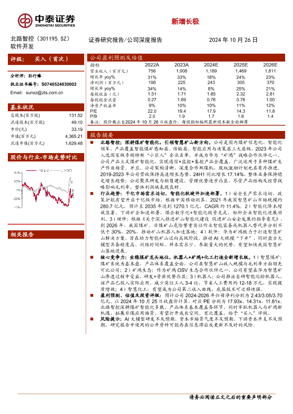 【中泰证券】【20241026】北路智控(301195)军煤矿智能化,矿鸿+井下机器人+智慧化工打造全新增长极-29页