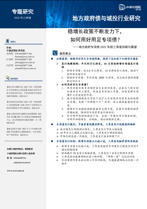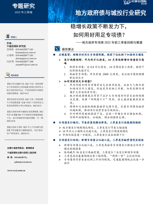 【中诚信国际】【20221013】中诚信-【地方政府专项债2022年前三季度回顾与展望】稳增长政策不断发力下,如何用好用足专项债?-14页