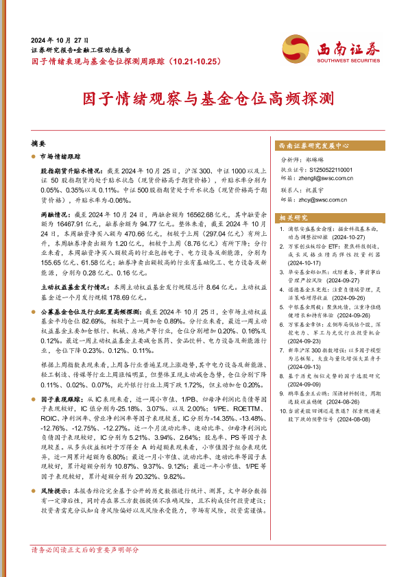 【西南证券】【20241027】因子情绪表现与基金仓位探测周跟踪:因子情绪观察与基金仓位高频探测-14页