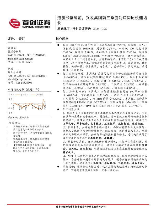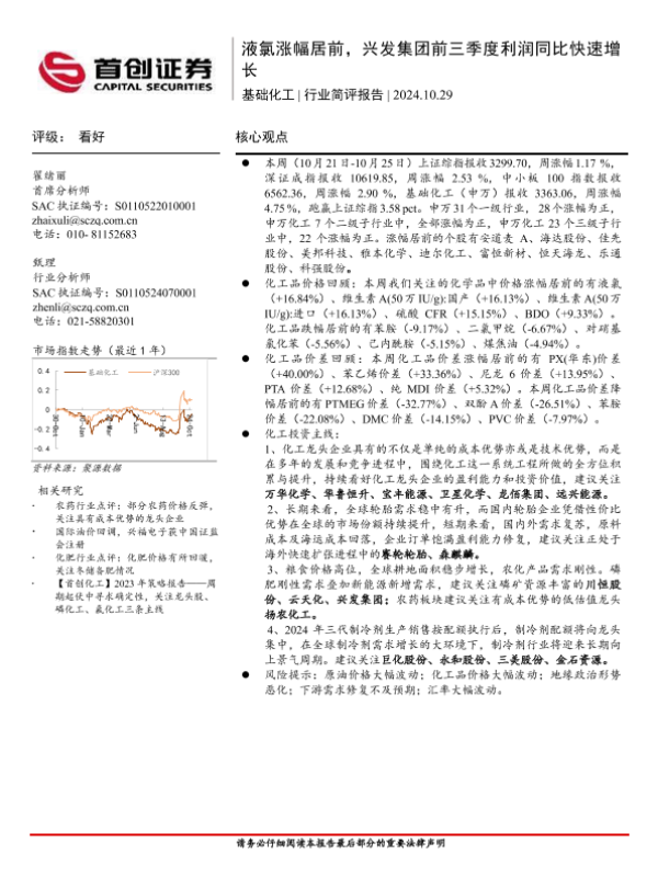 【首创证券】【20241029】基础化工行业简评报告:液氯涨幅居前,兴发集团前三季度利润同比快速增长-16页