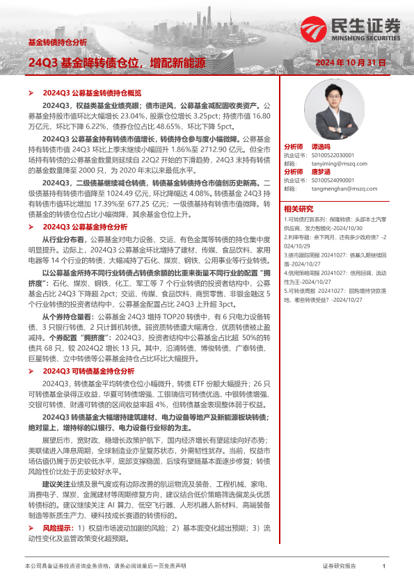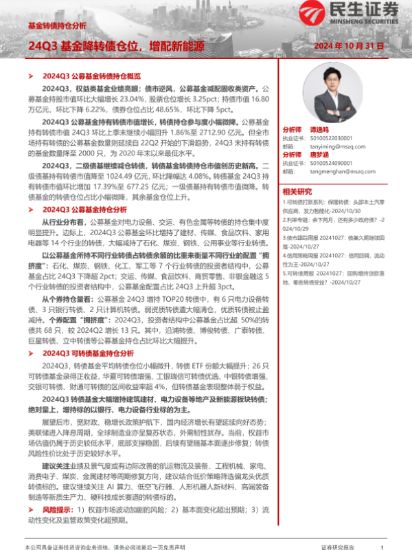 【民生证券】【20241031】基金转债持仓分析:24Q3基金降转债仓位,增配新能源-21页