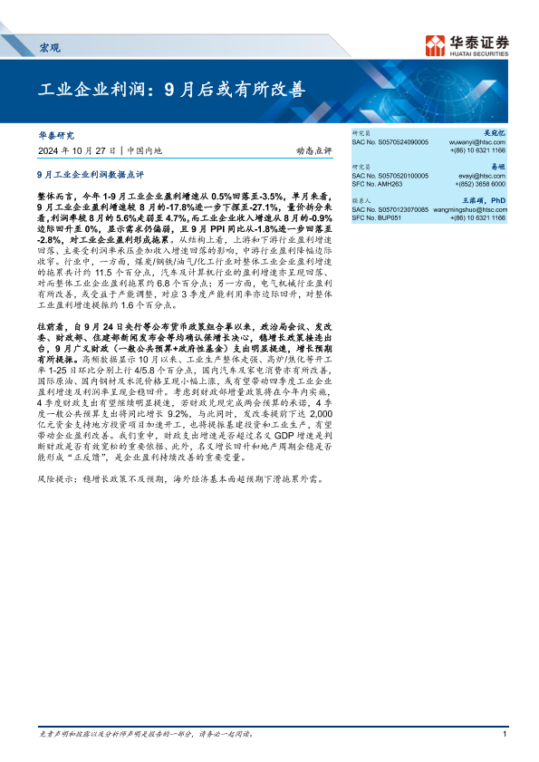 【华泰证券】【20241027】宏观动态点评-工业企业利润:9月后或有所改善-11页