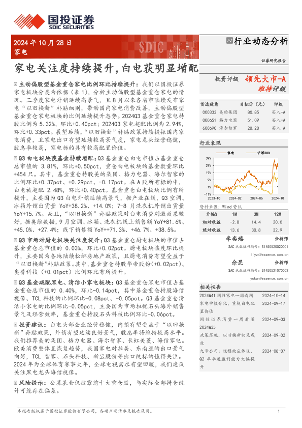 【国投证券】【20241028】家电行业动态分析:家电关注度持续提升,白电获明显增配-12页
