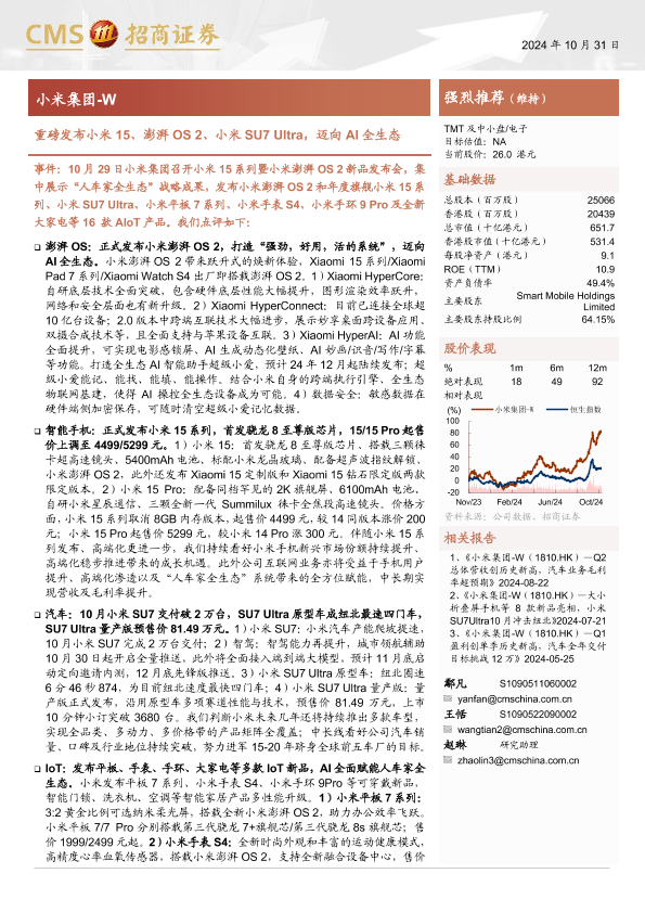 【海通证券】【20241031】小米集团-W(1810.HK)重磅发布小米15、澎湃OS2、小米SU7Ultra,迈向AI全生态-19页