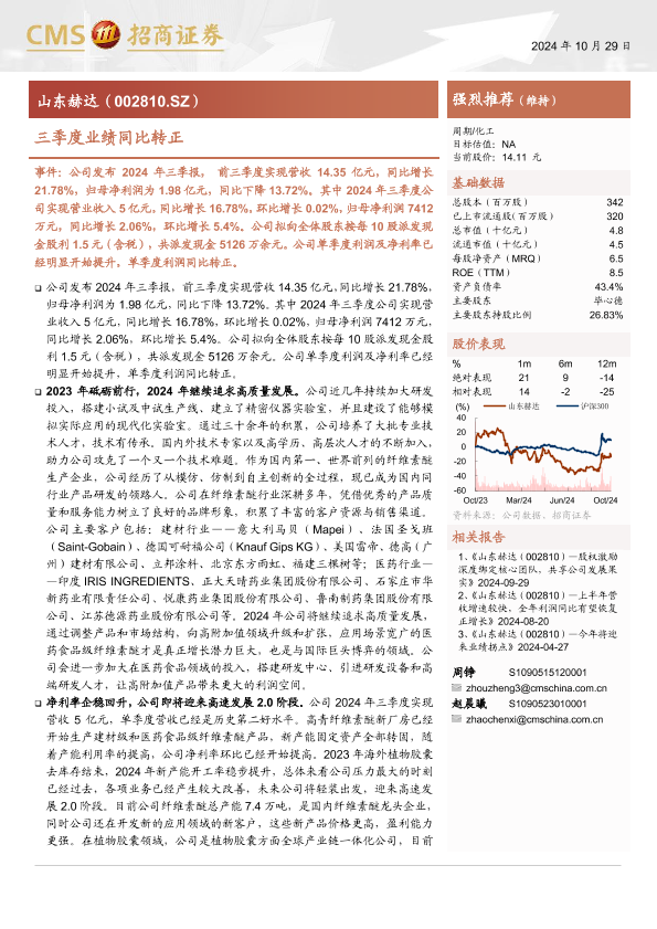 【海通证券】【20241029】山东赫达(002810)三季度业绩同比转正-16页