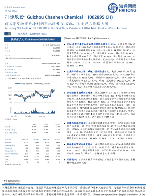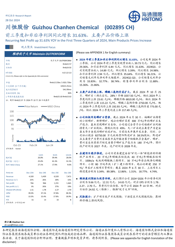 【海通国际】【20241028】川恒股份(002895)前三季度扣非后净利润同比增长31.63%,主要产品价格上涨-12页