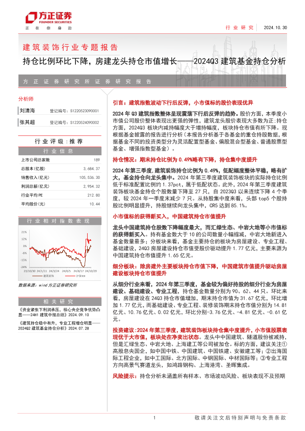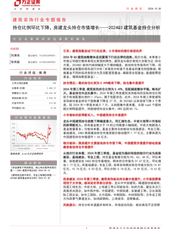 【方正证券】【20241030】建筑装饰行业专题报告-2024Q3建筑基金持仓分析:持仓比例环比下降,房建龙头持仓市值增长-25页