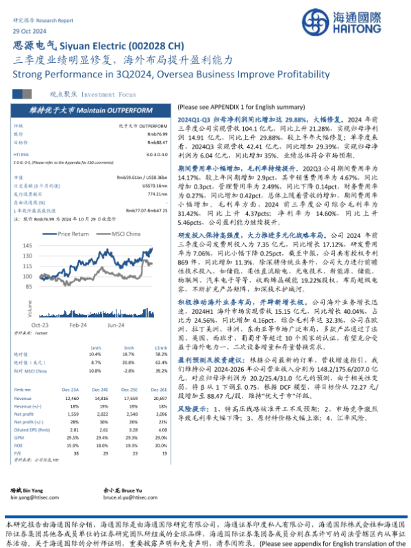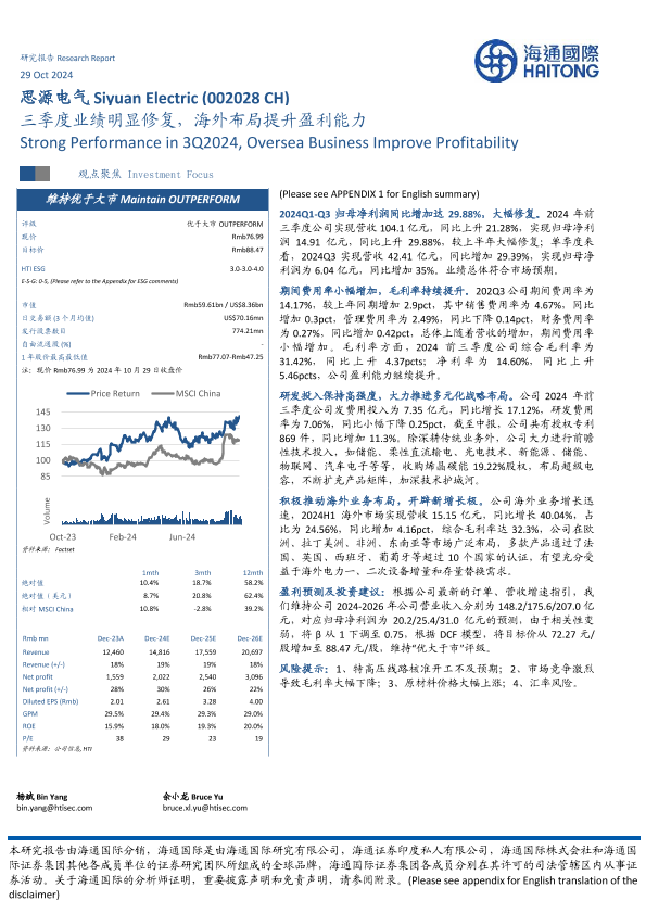 【海通国际】【20241029】思源电气(002024)三季度业绩明显修复,海外布局提升盈利能力-13页