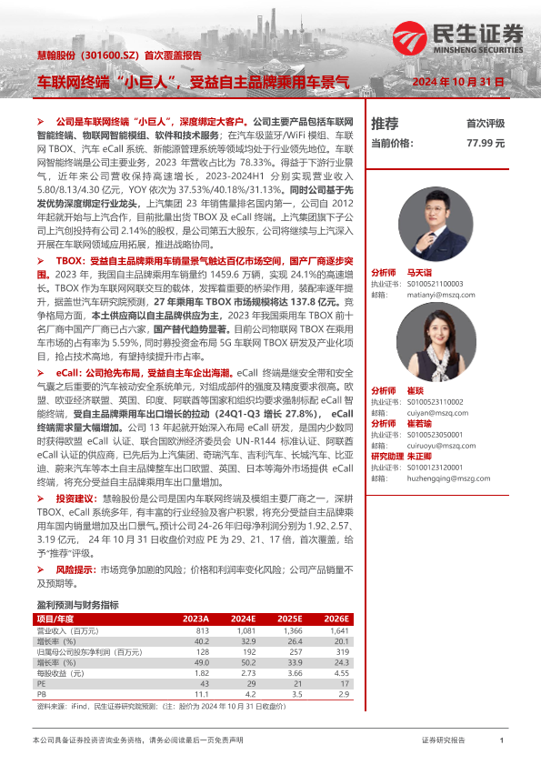 【民生证券】【20241031】慧翰股份(301600)首次覆盖报告:车联网终端“小巨人”,受益自主品牌乘用车景气-24页