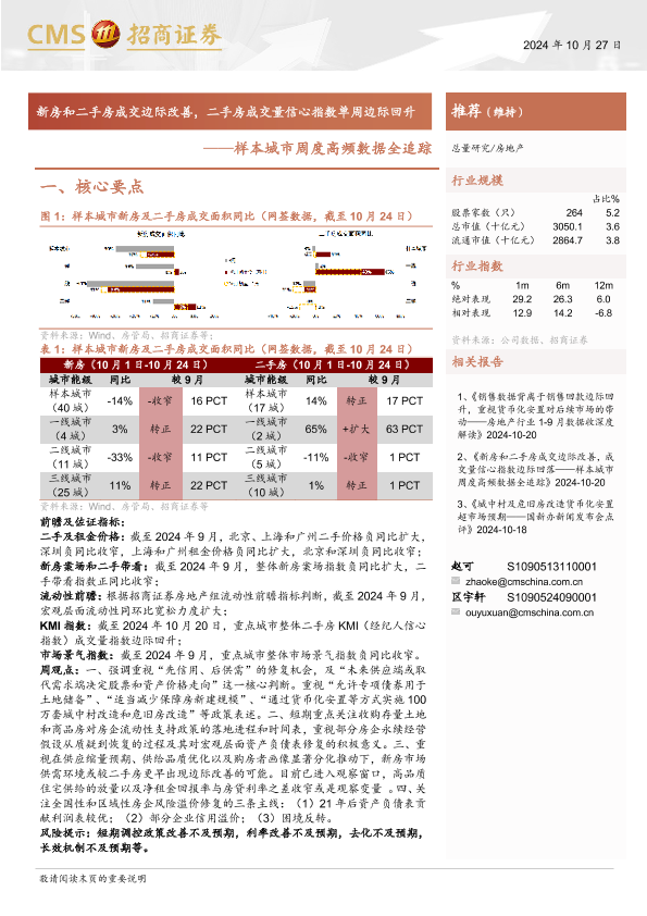 【海通证券】【20241027】房地产行业样本城市周度高频数据全追踪:新房和二手房成交边际改善,二手房成交量信心指数单周边际回升-12页