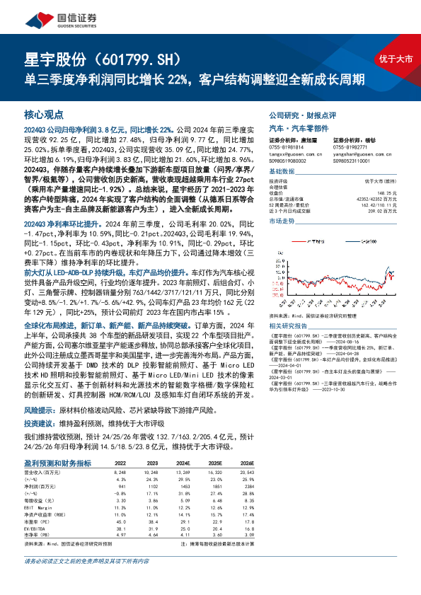 【国信证券】【20241027】星宇股份(601799)单三季度净利润同比增长22%,客户结构调整迎全新成长周期-16页