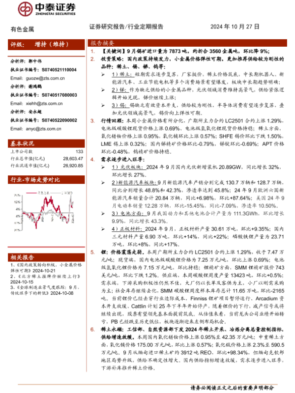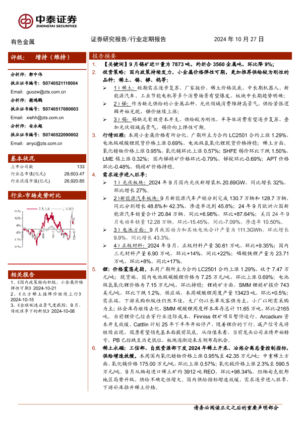 【中泰证券】【20241027】有色金属行业:缅甸供应不确定性增大,稀土价格回升-24页