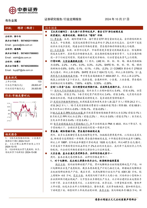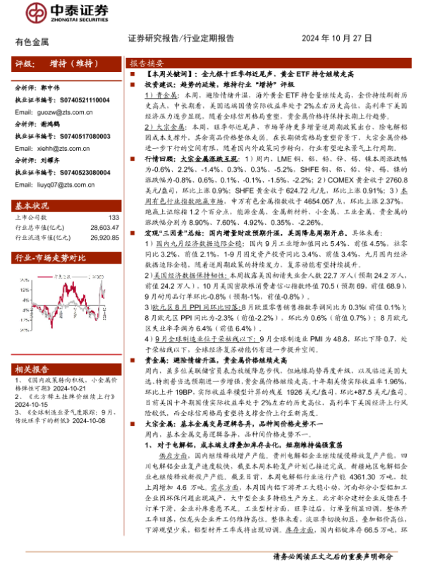 【中泰证券】【20241027】有色金属行业:增量政策有望持续出台,继续战略看多大宗板块-34页