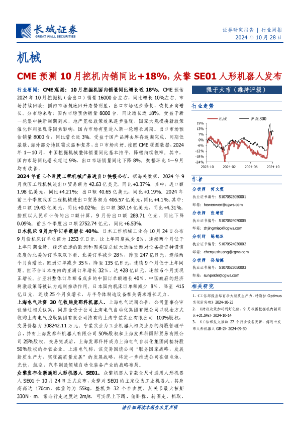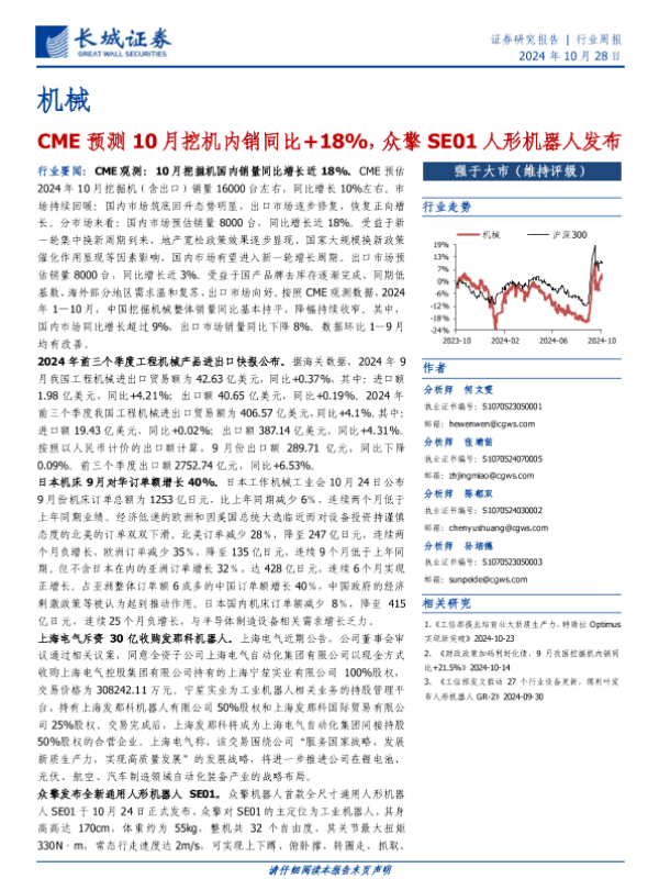 【长城证券】【20241028】机械行业:CME预测10月挖机内销同比+18%,众擎SE01人形机器人发布-14页