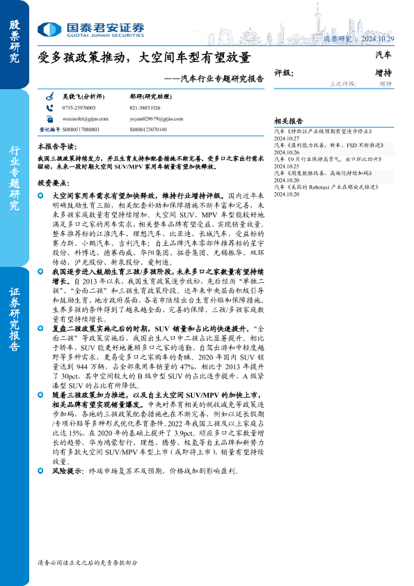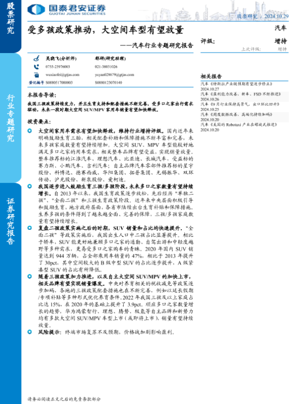 【国泰君安证券】【20241029】汽车行业专题研究报告:受多孩政策推动,大空间车型有望放量-13页