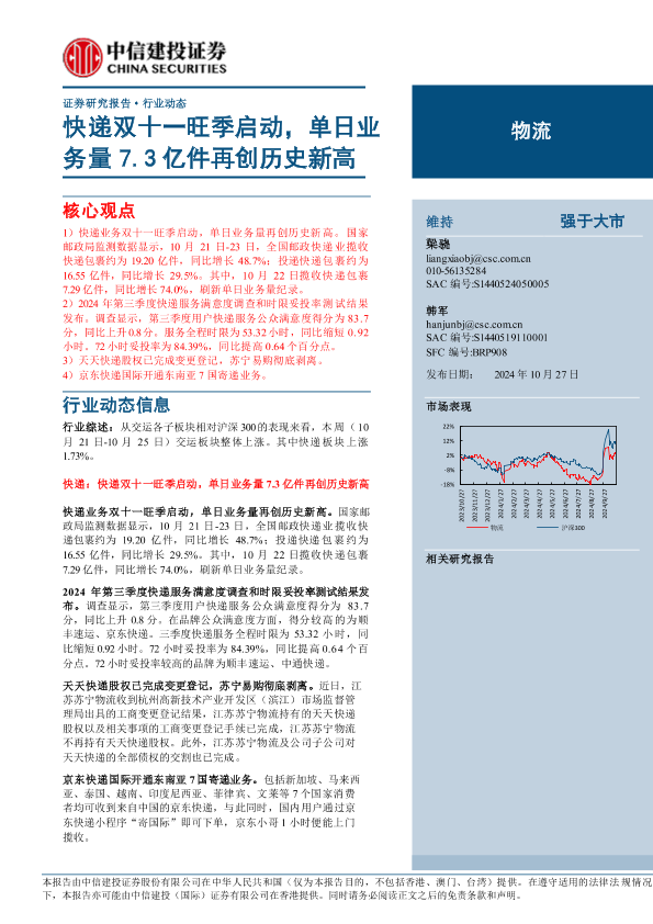 【中信建投证券】【20241027】物流行业:快递双十一旺季启动,单日业务量7.3亿件再创历史新高-17页