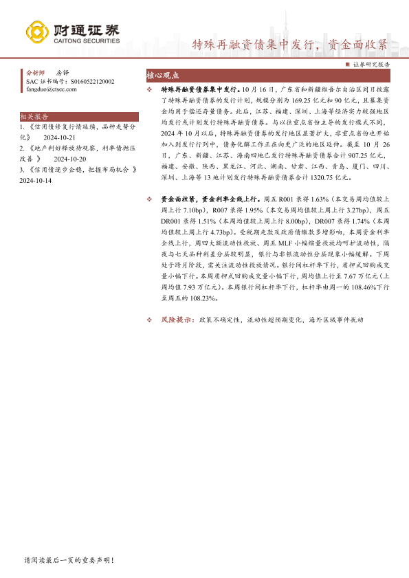 【财通证券】【20241027】特殊再融资债集中发行,资金面收紧-14页