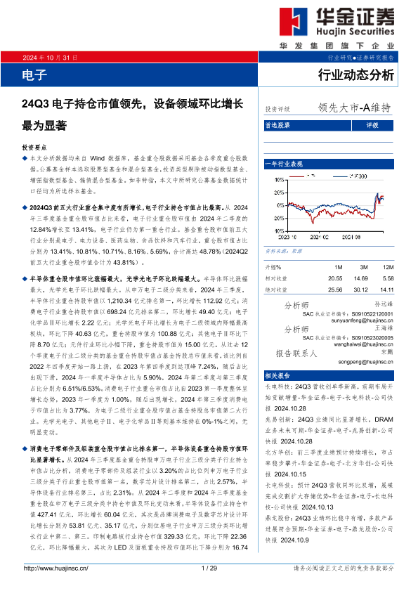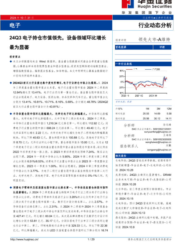【华金证券】【20241031】电子行业动态分析:24Q3电子持仓市值领先,设备领域环比增长最为显著-29页