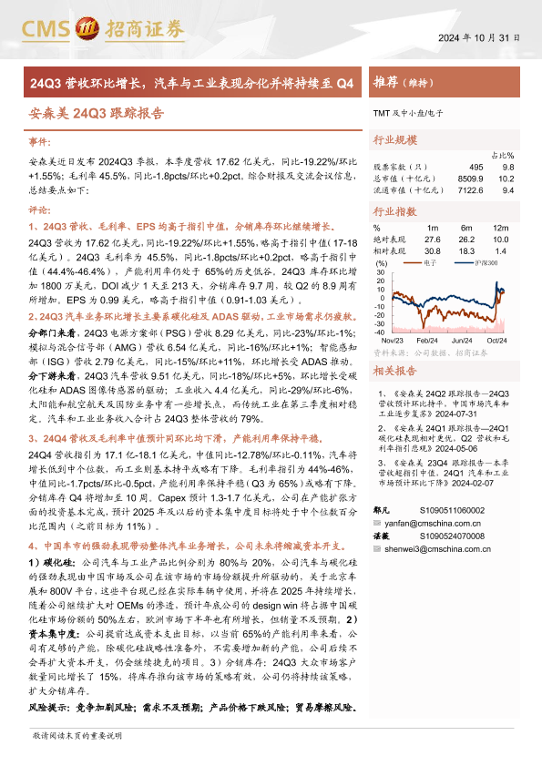 【海通证券】【20241031】电子行业安森美24Q3跟踪报告:24Q3营收环比增长,汽车与工业表现分化并将持续至Q4-14页
