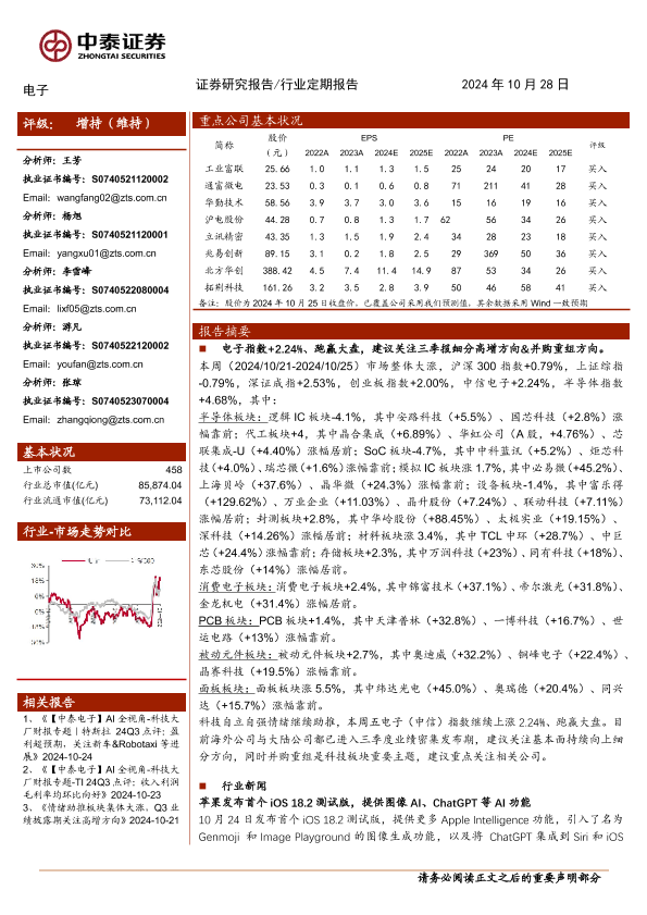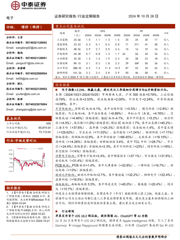【中泰证券】【20241028】电子行业:三季报密集发布,持续关注业绩高增方向&并购重组方向-15页