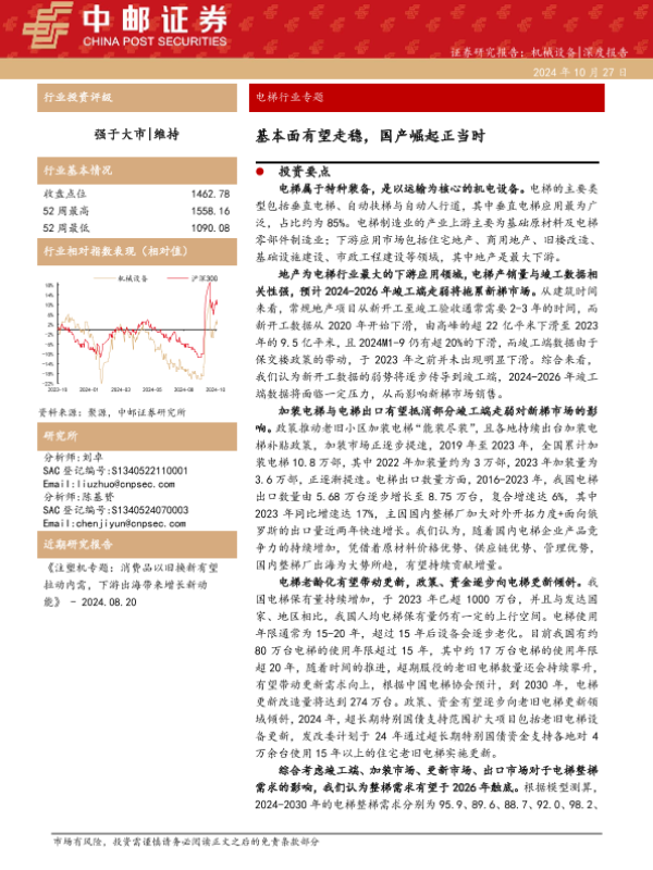 【中邮证券】【20241027】电梯行业专题:基本面有望走稳,国产崛起正当时-19页