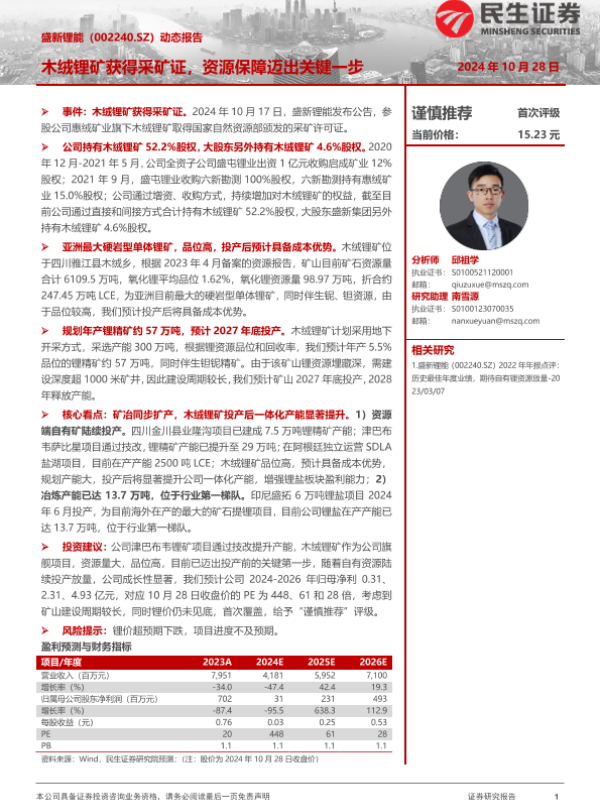 【民生证券】【20241028】盛新锂能(002240)动态报告:木绒锂矿获得采矿证,资源保障迈出关键一步-13页