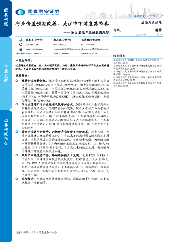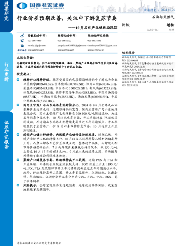 【国泰君安证券】【20241027】石油与天然气行业-10月石化产业链数据跟踪:行业价差预期改善,关注中下游复苏节奏-14页