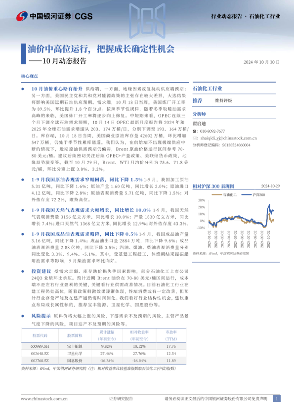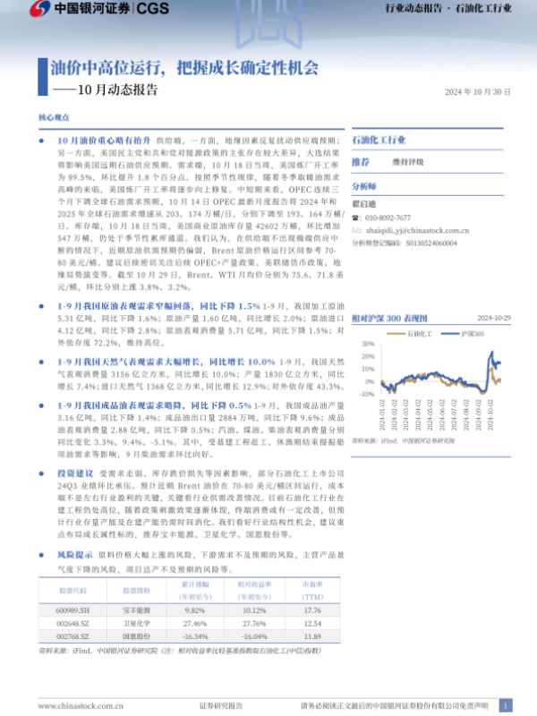 【银河证券】【20241030】石油化工行业10月动态报告:油价中高位运行,把握成长确定性机会-22页