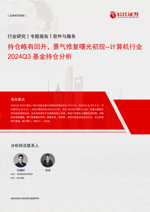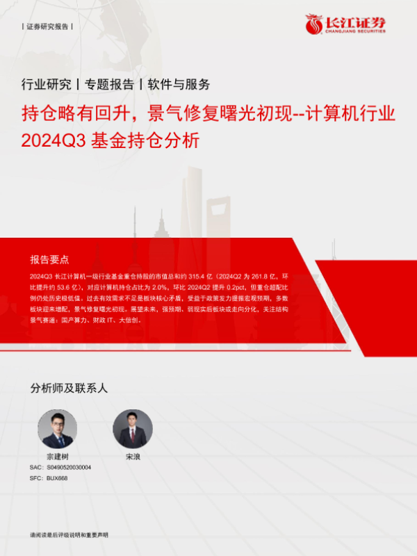 【长江证券】【20241027】计算机行业2024Q3基金持仓分析:持仓略有回升,景气修复曙光初现-13页