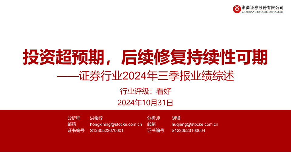 【浙商证券】【20241031】证券行业2024年三季报业绩综述:投资超预期,后续修复持续性可期-25页
