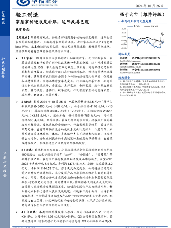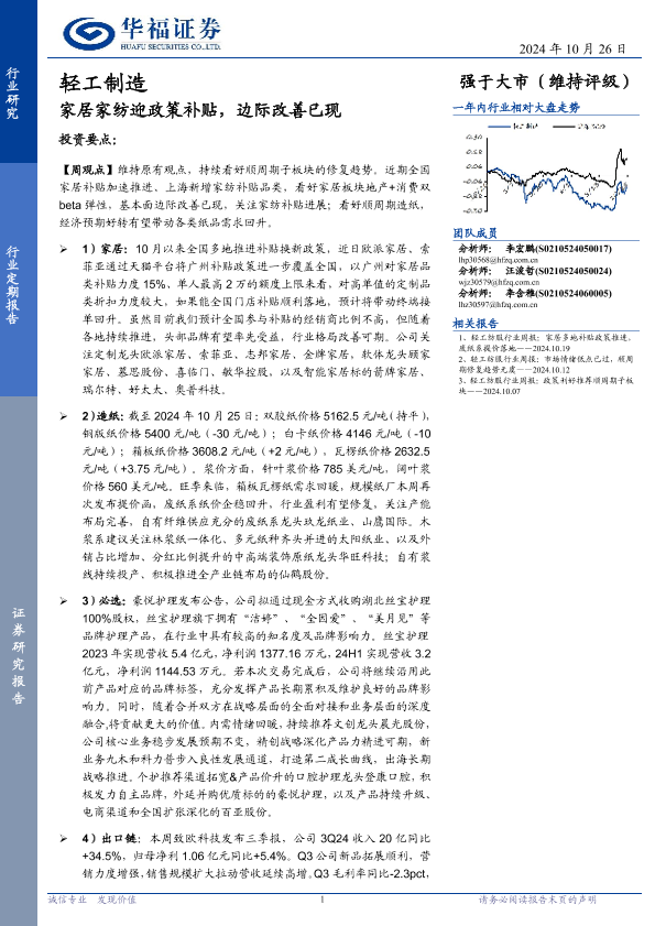 【华福证券】【20241026】轻工制造行业定期报告:家居家纺迎政策补贴,边际改善已现-21页