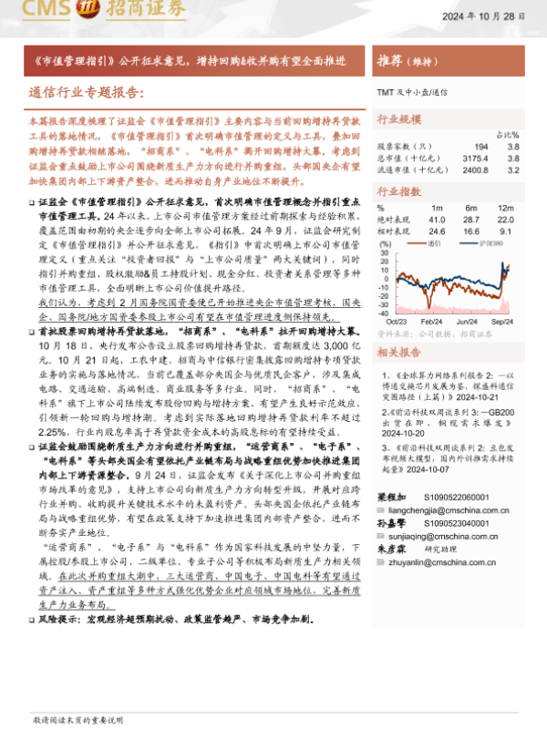 【海通证券】【20241028】通信行业专题报告:《市值管理指引》公开征求意见,增持回购&收并购有望全面推进-24页