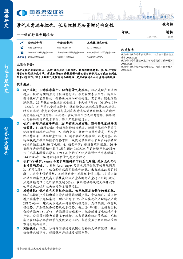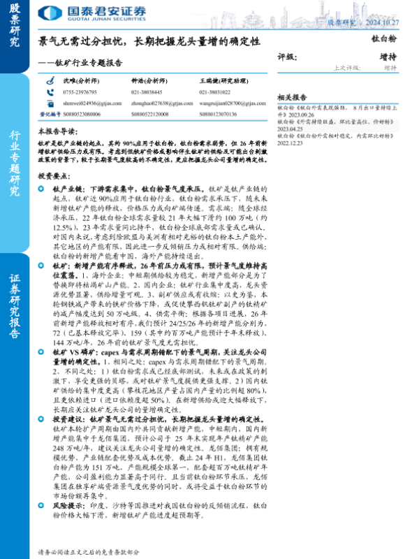 【国泰君安证券】【20241027】钛矿行业专题报告:景气无需过分担忧,长期把握龙头量增的确定性-17页