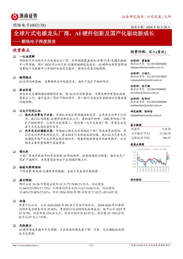 【浙商证券】【20241028】顺络电子(002138)深度报告:全球片式电感龙头厂商,AI硬件创新及国产化驱动新成长-21页