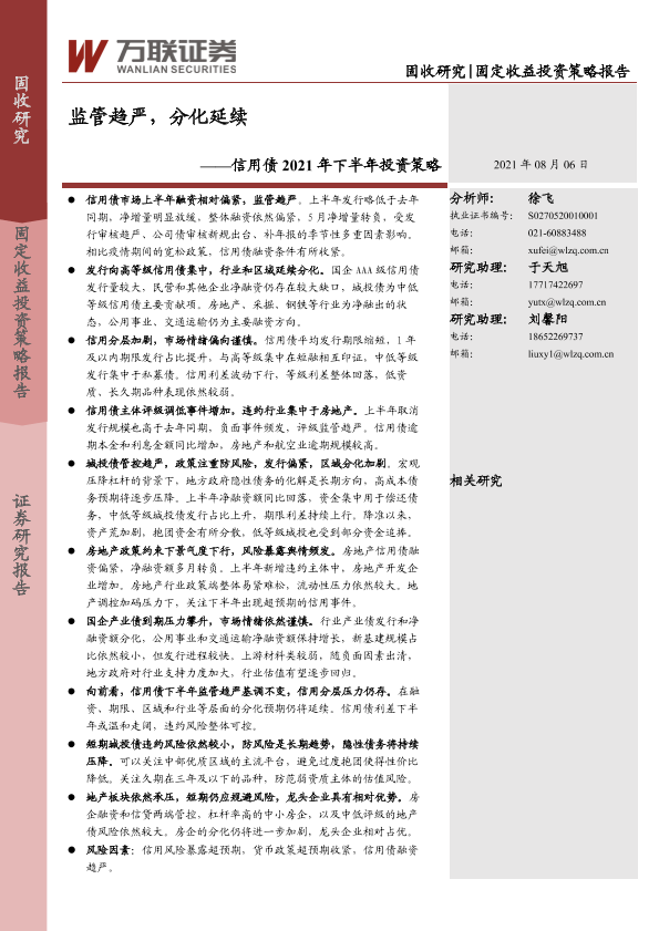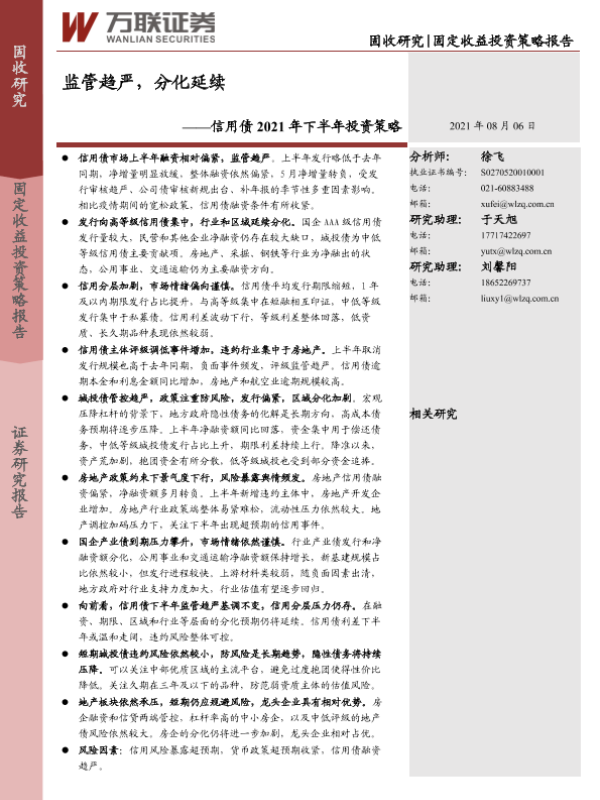 【万联证券】【20210806】信用债2021年下半年投资策略:监管趋严,分化延续-18页