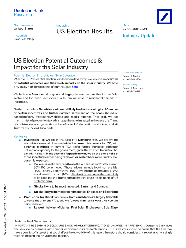 【Deutsche Bank Research】【20241027】US Election Results US Election Potential Outcomes & Impact for the Solar Industry-11页