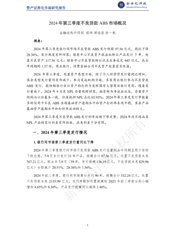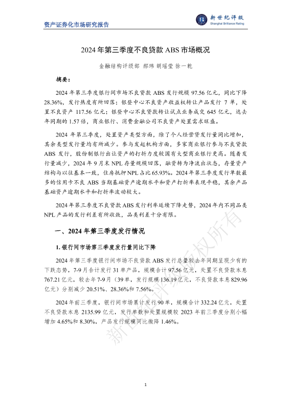 【金融结构评级部】【2024】2024年第三季度不良贷款ABS市场概况-8页